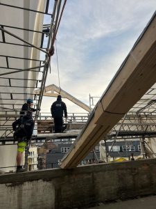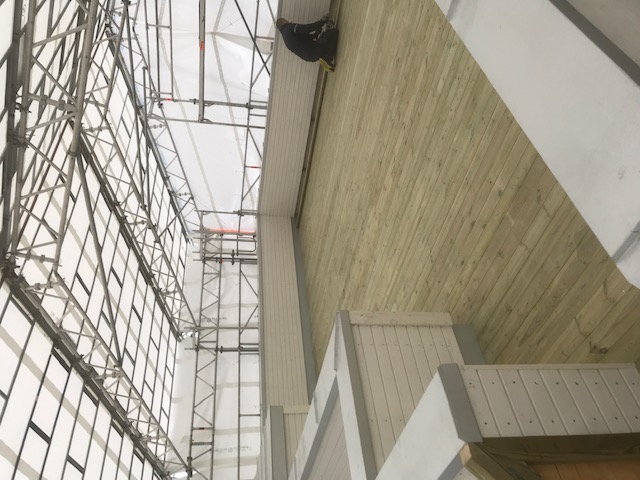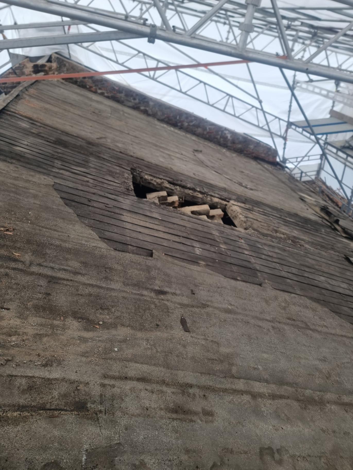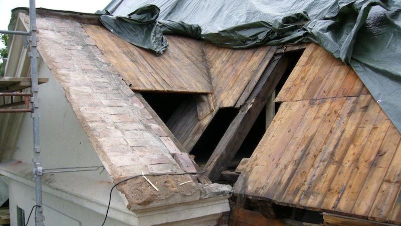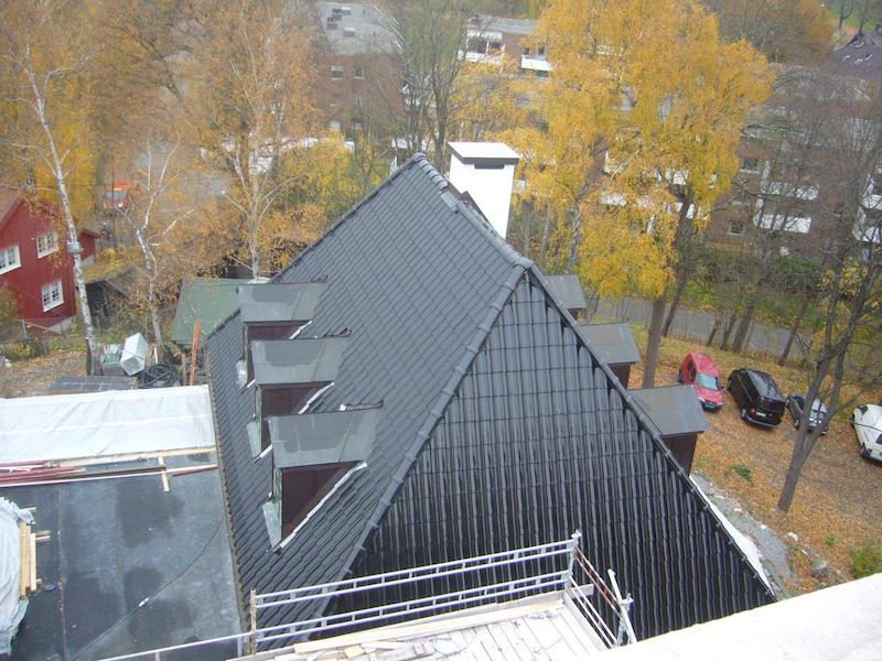 Feilkonstruksjon fra opprinnelig byggetid førte til vann- og soppskader. Hele taket ble fjernet og erstattet med en ny, ventilert takkonstruksjon.